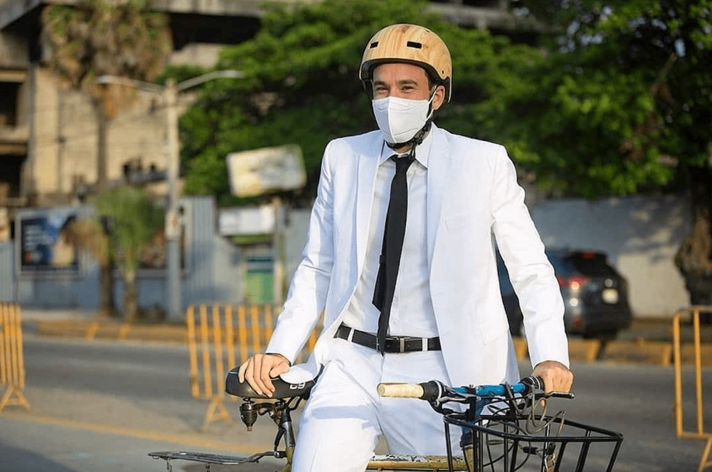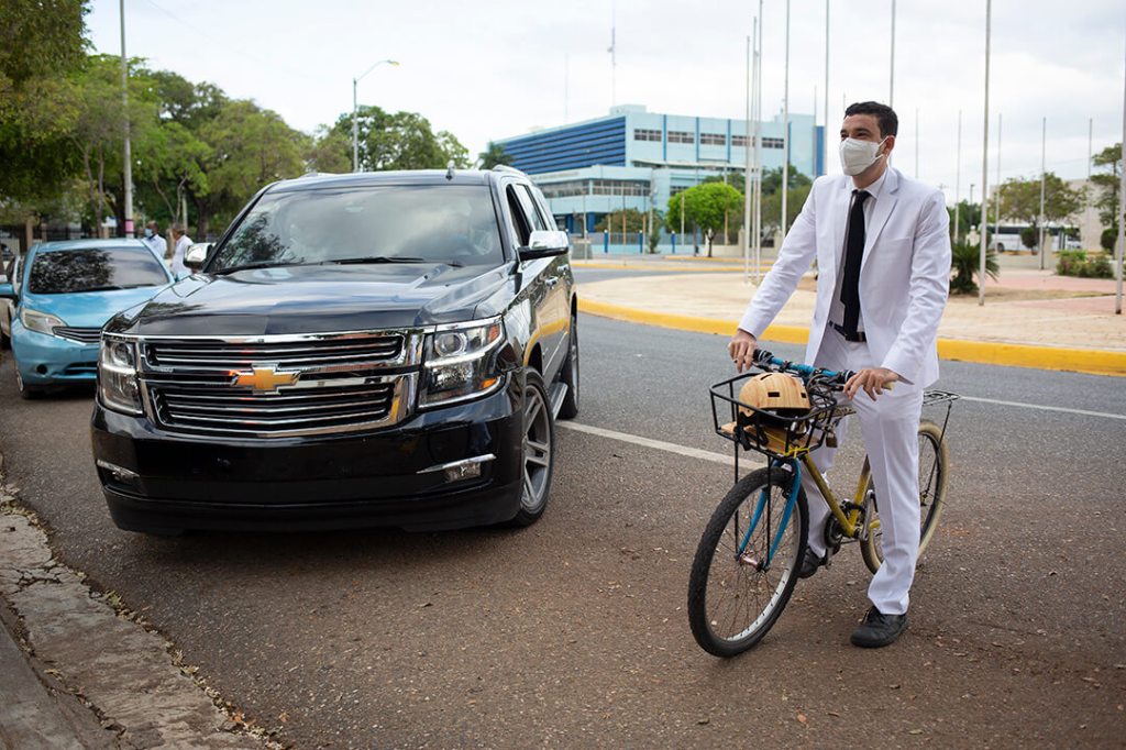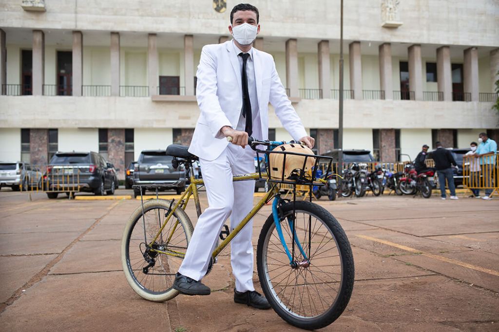 “Soy regidor”, dijo el ciclista, quien portaba un traje blanco, corbata negra, y mascarilla, a quien el cuerpo de seguridad de la Alcaldía no permitía su entrada por el inusual medio de transporte. Fue retenido unos segundos hasta que un periodista de Listín Diario les confirmó que se trataba de Mario Sosa, un nuevo regidor. (LD)